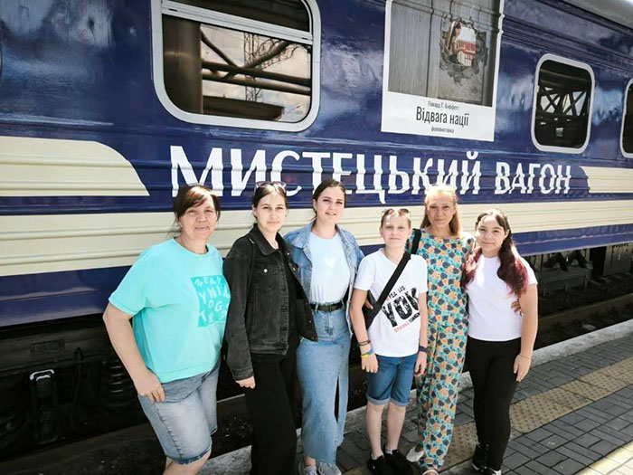 Мистецький поїзд – це мандрівна галерея, створена за підтримки Howard G. Buffett Foundation, де у спеціально переобладнаних вагонах з унікальним світловим і музичним оформленням представлена виставка «Courage of a Nation» про незламність українців, очима американського філантропа та фотографа Говарда Баффетта. Він несе з собою не просто фотографії, а історії — про біль, силу, надію й світло.