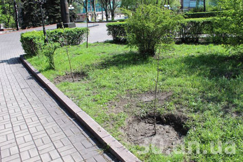 Дерево, высаженное Президентом Украины 2 года назад в сквере им. Берегового в Енакиево, засохло, и заменено новым саженцем.