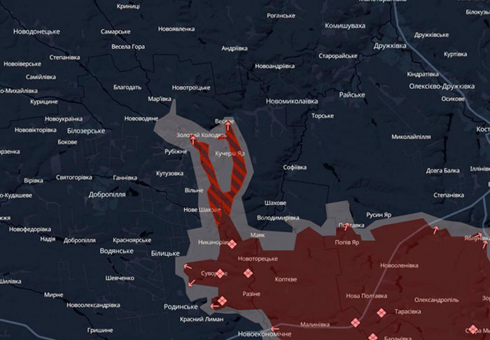 Зараз окупанти змогли за допомогою постійного тиску переважаючою кількістю піхоти просунутися в села Кучерів Яр та Золотий Колодязь, де проводять накопичення для подальшого розвитку успіху. На відрізку свого шляху ЗС рф намагаються встановлювати позиції та закріплюватися на місцевості. Також з Кучерового Яру по посадках росіяни проникли до села Веселе та проводять накопичення і там. За даними аналітиків, «за останню добу у цьому селі зафіксували вже близько 20 загарбників».