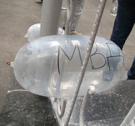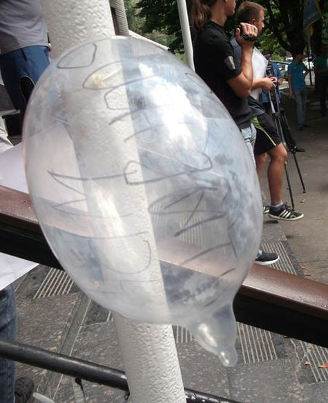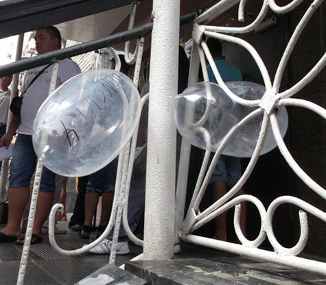 Толпа разошлась не на шутку, многие стали разворачивать транспаранты и увеличенные фотографии избитого Олега Богданова. Кто-то стал надувать презервативы, писать на них маркером послания в адрес милиции и развешивать на перилах крыльца. Потом все дружно начали скандировать: «Ганьба!»