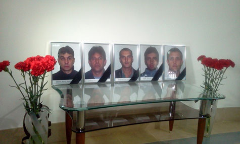 Сегодня портреты погибших в результате аварии работников "Стирола" с траурными лентами выставлены в холле административного здания химического концерна.