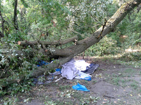 Вызванные на место ЧП спасатели с помощью бензопилы распилили дерево и убрали его от палатки. Тело погибшего, личность которого сейчас устанавливается, передали сотрудникам милиции.
