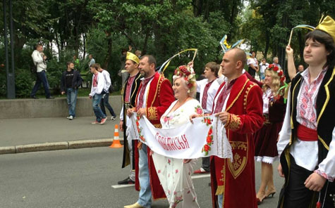 Кроме Славянска, фурор в Киеве произвела и делегация из Сум, - сообщают центральные СМИ. Правда, фурор неоднозначный. Двигались-то они красиво (колонну сопровождали духовой оркестр военной части А1476, ансамбль народного танца «Весна», народная дизайн-студия «ART'el modа» и арт-группа «Киви»). Вот только 12 моделей, раскрашенных в стиле body-art (красиво, орнаментально), шли... топлесс. Так что девушки наслушались в свой адрес и комплиментов (как правило, от мужчин), и возгласов «Ганьба!» (от представительниц прекрасного пола).