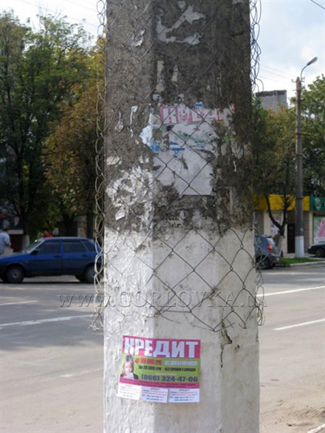 В Горловке, в центральных районах города, опоры столбов... обтянули сеткой-рабицей. Так, по словам заместителя городского головы Горловки Вадима Исакова, одна из коммерческих организаций города борется с расклейкой объявлений.