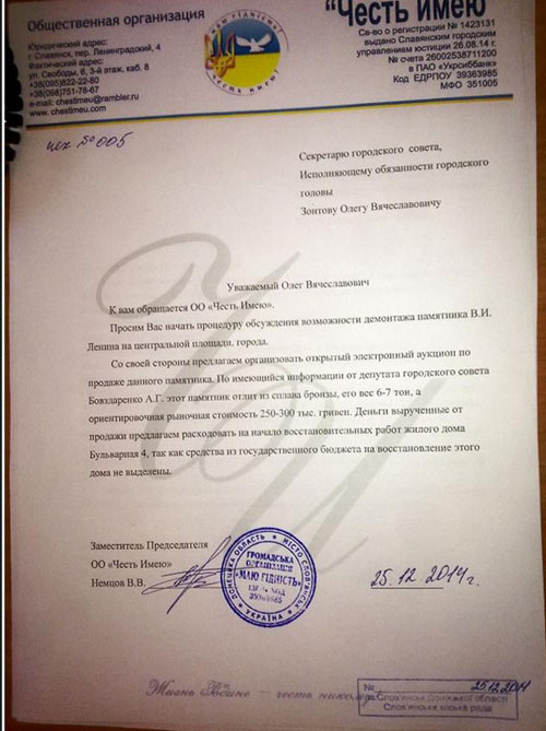 Кроме того, практически одновременно с «Гуртом» Общественная организация «Честь имею» зарегистрировал несколько писем на имя секретаря горсовета Славянска Зонтова О.В. в которых идет речь о продаже памятника Ленину с аукциона. Заметим, что в сборе подписей за снос памятника "Честь имею" участия не принимает.