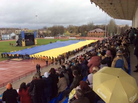 Сегодня, 19 апреля, в Артемовске на стадионе Металлург прошла акция "Артемовск - это Донбасс, Донбасс - это Украина", во время которой участники развернули самый большой в Украине флаг (2400 квадратных метров).