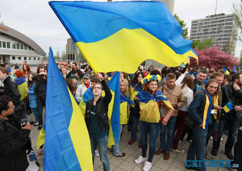 В этот день более тысячи дончан под государственными флагами собрались возле РСК "Олимпийский" и после короткого митинга пошли колонной в сторону ТЦ "Донецк-Сити".