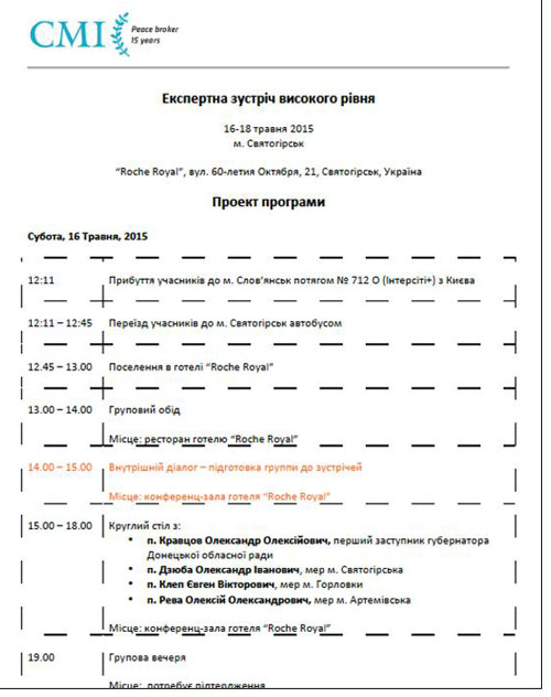 Встреча проходит без журналистов и носит секретный характер, повестка дня не разглашается. Также на 2 дня в Святогорск из Киева прибыли и некоторые депутаты Верховной Рады. Вчера на встрече присутствовал и экс-председатель Донецкой областной государственной администрации, а сейчас народный депутат Украины, олигарх Сергей Тарута.