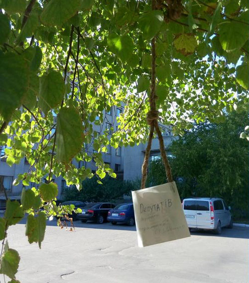 На дереве висит веревка, к концу которой прикреплена записка со словами одного из произведений Тараса Шевченко "Депутатів живих, мертвих і ненароджених", - сообщают "Новости Донбасса".