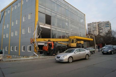 На улице Карла Либкнехта в Мариуполе произошло зрелищное ДТП с участием подъёмного крана. Как сообщает издание "0629", транспортное средство въехало в новопостроенное офисное здание, разгромив при этом стекла и перегородки с первого по третий этаж.