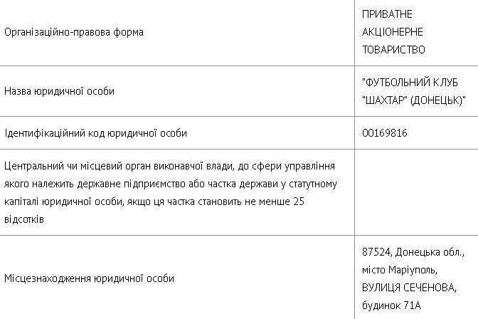 Согласно Реестру, футбольный клуб "Шахтер" отныне зарегистрирован в Мариуполе.