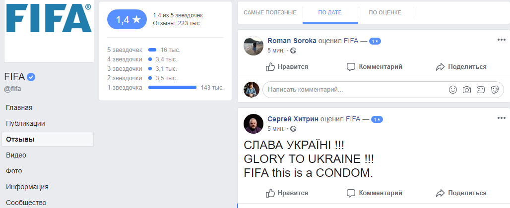 Официальная страница ФИФА в социальной сети Facebook стремительно упала в рейтинге почти до полутора звезд из пяти возможных, - сообщает "Корреспондент".