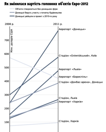 А издание http://texty.org.uaграфически изобразило процесс на тему «Как изменилась стоимость главных объектов Евро-2012». Эти объекты разбиваются по динамике их стоимости на три категории: те, что строятся без «донецких» фирм, те, что строятся с самого начала с участием «донецких» и те, в строительство которых «донецкие» вошли после президентских выборов 2010 года.