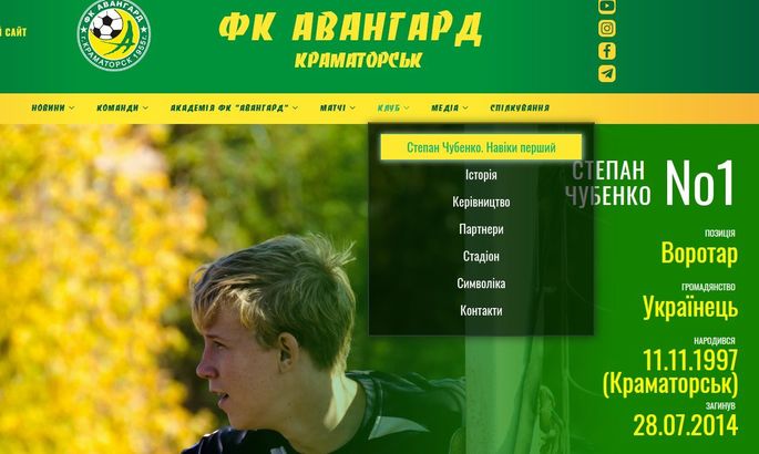 Вратарь молодежного состава краматорского "Авангарда" Степан Чубенко был убит летом 2014 года. Парень участвовал в митингах в поддержку целостности Украины, которые проводились в Краматорске. Во время обстрела он помогал спускаться в убежище пожилым людям, носил им воду, когда город оказался отрезанным от водоснабжения. Рискуя жизнью, Степан снял с городской площади флаг "ДНР". В июне 2014-года Степан уехал к другу в Киев. 23 июня он сел на поезд в столице, чтобы вернуться домой. Ехал через Донецк, где был задержан боевиками из батальона "Керчь" за желто-голубую ленту на рюкзаке. После пыток украинского патриота расстреляли.