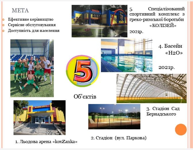 Создание КП «Спортсервис» необходимо для обслуживания 5 объектов: ледовой арены «КоvZаnка», нового стадиона по улице Парковой, стадиона в Саду Бернацкого, бассейна "H2O" (который будет закончен в 2021 г.), а также специализированного спорткомплекса греко-римской борьбы «Колизей» (также в 2021 г.). Все они будут открыты для жителей и гостей Краматорска.