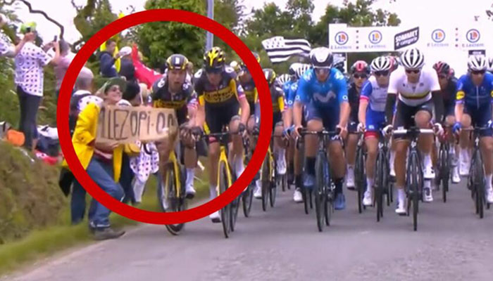 Во время гонки, женщина с плакатом пыталась попасть в кадр перед пелотоном, когда ее задел немецкий велосипедист Тони Мартин. Спортсмен упал, а за ним упали еще десятки других велосипедистов.
