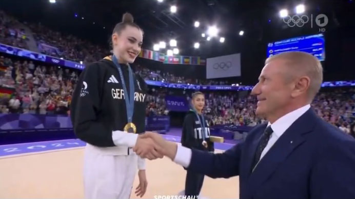 Колишній президент НОК України Сергій Бубка вручив золоту медаль росіянці з німецьким паспортом Дар’ї Варфоломеєвій, яка виграла фінал Олімпійських ігор в особистому багатоборстві художньої гімнастики.
