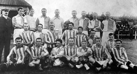Фотография 1913 года. Первый матч на Кубок Донбасса. Футболисты Юзовки (с кубком) и Краматоровки (стоят на втором плане). Крайний слева, в кепи - первый лидер Футбольной лиги Донбасса Дрейман.