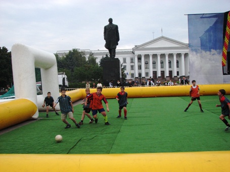 На площади установлено поле для игры в мини-футбол, и страсти не только вокруг мяча, но и среди зрителей кипят нешуточные.