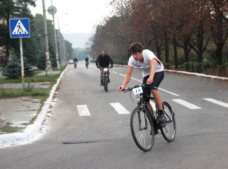 В сопровождении машины ГАИ с мигалками, носятся, наматывая круги вокруг площади, велосипедисты. Более 60 спортсменов борются за право стать первым.