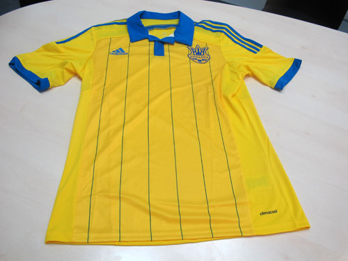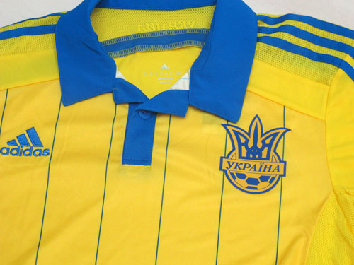 Новая домашняя форма сборной Украины желтого цвета с синими вертикальными полосками. Футболка выполнена в стиле поло. отличительной чертой игровых шорт стали горизонтальные вставки из голубого и желтого цветов, которые символизируют флаг Украины.
