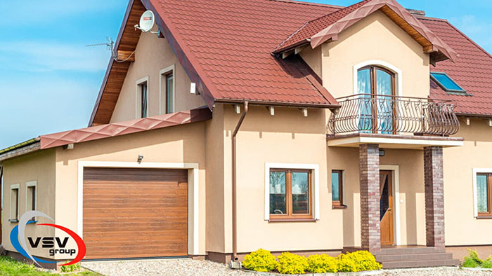 - Стильный внешний вид. Секционные ворота можно подобрать под любое здание, их выполняют в любом цвете и фактуре, есть возможность имитации различных материалов (разных пород древесины, камня, металла и т. д.).