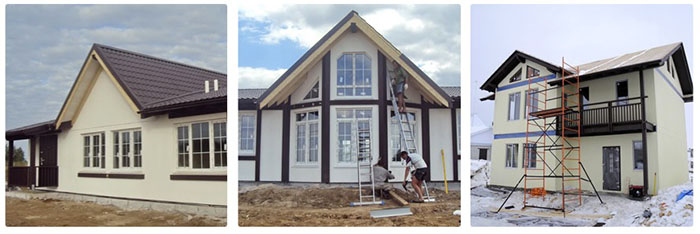 Цементно-стружечные плиты - самый влагоустойчивый материал, поэтому собранный из них дом, может обходиться без финишной отделки. Из-за повышенной массы материала, листы имеют меньший размер, что увеличивает время строительства.