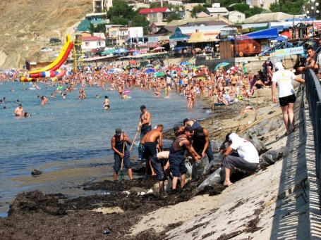 А накануне нашего приезда в Орджоникидзе, несколько суток подряд штормило, и часть пляжа полуметровым слоем покрыли черные водоросли. Сутки они еще пахли свежестью, морем и йодом, а потом стали дико вонять. Убирать их явилась на тракторе бригада молодых людей в ярких оранжевых жилетах, и дружок проспорил мне бутылочку местного «Крымского», когда я пытался убедить его, что эти жэкэхашные парни - на самом деле служивые.  Секрет был прост: у всех, под одну машинку, короткие стрижки, и, при 40-градусной жаре, на ногах - типичные армейские «берцы». Холодненькое «Крымское» я выпил (кстати, вполне приемлемо, что бы ни говорили про крымскую воду), а парни на следующий день уже трудились на очистке, обутые кто во что горазд. «Мальчики, выручайте! - обмахивалась газеткой рядом с ними административного вида тетка, - А мы уж покормим - это вам не казарма...»