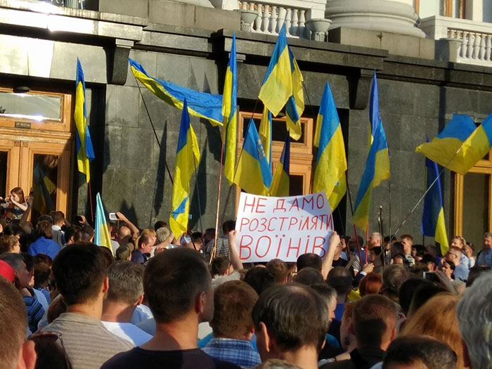 Участники акции сначала выкрикивали "Чувак, выходи" и "Слуга выходи, народ пришел". Также на митинге было много украинских флагов и плакаты с фразами "Нет капитуляции" и "Не дадим расстрелять воинов".