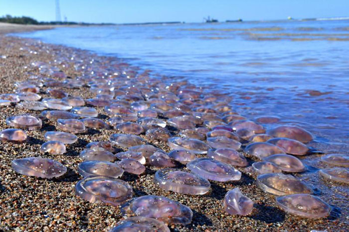 Этим летом возле берега находят в основном 3 вида медуз: аурелию, синюю медузу и мнемиопсиса. Опасаться стоит в основном синих медуз. Их ожог болезнен. Узнать этот вид можно по синей кайме вокруг купола. Брать таких медуз руками ни в коем случае нельзя.