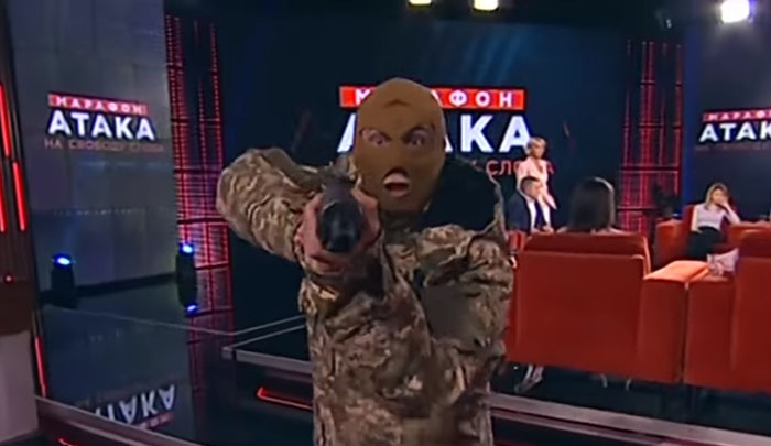 Во время марафона "Атака на свободу слова" в студию ворвались неизвестные в камуфляже, масках и с оружием. Как оказалось, "захват" телеканала - постановка. Произошедшее напугало присутствующих в студии людей, они начали прятаться.