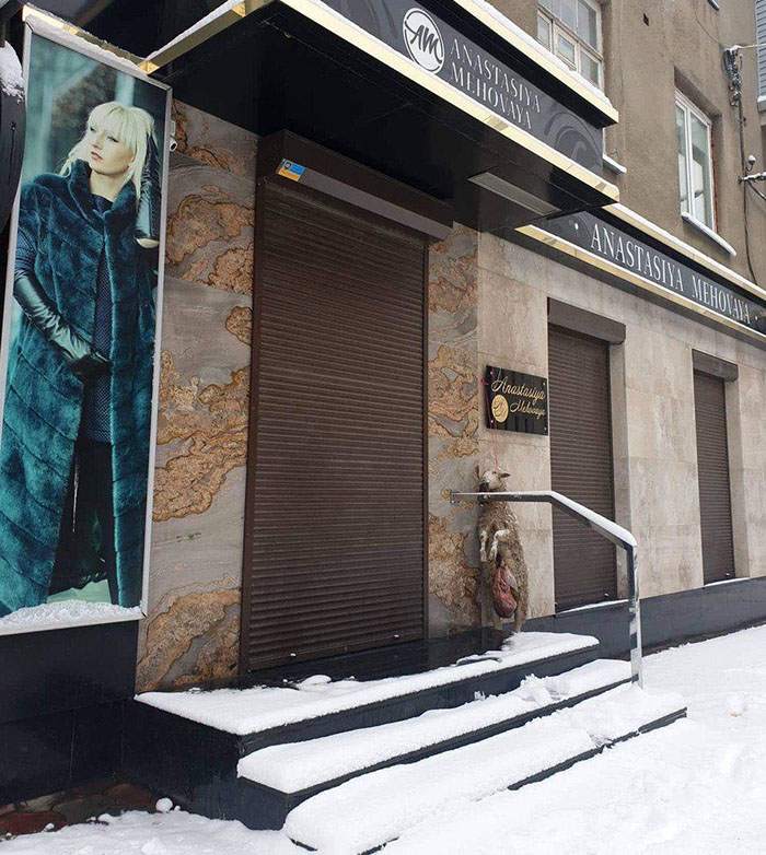 Дикий случай произошел сегодня ночью в центре Харькова: на улице Маяковского к табличке магазина, торгующего натуральными мехами, неизвестные личности подвесили труп выпотрошенной овцы.