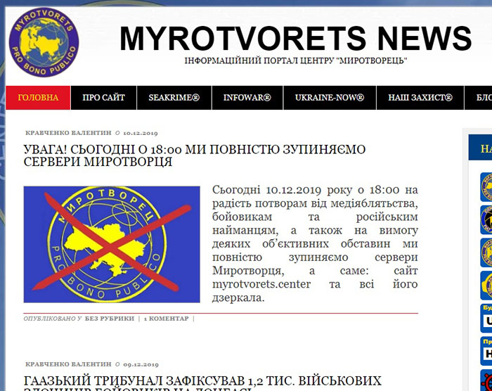 "Сегодня 10.12.2019 года в 18:00 на радость тварям от медиабл***ва, боевикам и российским наемникам, а также по требованию некоторых объективных обстоятельств, мы полностью останавливаем серверы Миротворца, а именно: сайт myrotvorets.center и все его зеркала, - говорится в сообщении. - Доступ к сведениям об объектах нашего исследования в разделе Чистилище будет временно обеспечен только для отдельных категорий пользователей на определенном закрытом ресурсе. Все остальные проекты Центра работать и дальше в открытом и доступном режиме".