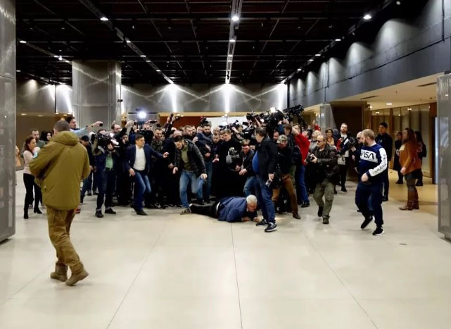 Однако провести полноценную презентацию Сергею Сивохо не дали. Активисты "Национального корпуса", других националистических организаций и ветераны АТО, присутствующие на презентации, громкими криками выражали свое неудовольствие. "Нацкорпусовец" Сергей Тамарин возмутился, что Сергей Сивохо отказался назвать Россию врагом Украины. Группа националистов прорвалась к советнику секретаря СНБО, начали его толкать и продолжали оскорблять. Его сбили с ног и пытались избить.