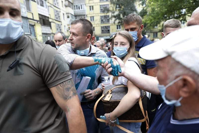 Охрана прикрыла мера и увела его с места встречи, но через некоторое время он вернулся и продолжил общение в испачканной зеленкой рубашке.
