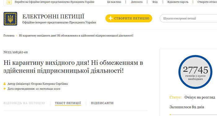 На официальном сайте петиций в адрес главы украинского государства собрала необходимый минимум в 25.000 голосов петиция, авто которой выступает за отмену "карантина выходного дня" и ограничения предпринимательской деятельности.