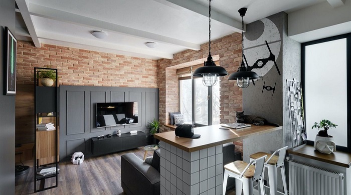 - По сути – это одна большая комната, планировка в которой продумывается очень тщательно, чтобы рационально разместить зоны отдыха, сна, работы, приготовления пищи.