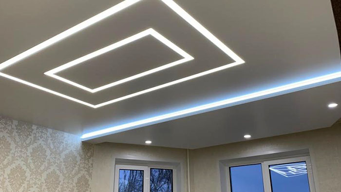 Возможности очень широкие, начиная от идеально ровной поверхности без дополнительного декора, заканчивая многоуровневыми конструкциями с подсветкой из множества светодиодных светильников.