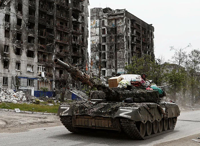Коренюк и ее дети покинули Украину 8 апреля и живут у британской пары в Ноттингемшире. На фотографии, сделанной в конце мая, видно, как танк проезжает мимо разбомбленных жилых домов в городе Попасная. Российские войска контролируют этот город в Луганской области с 8 мая.