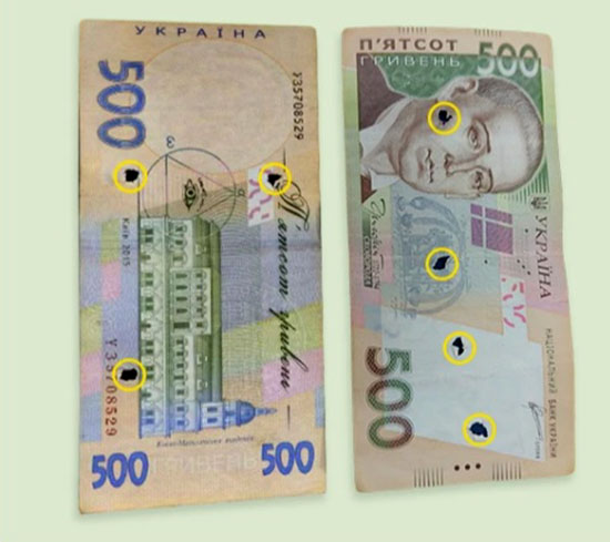 На сьогодні до НБУ надійшли на дослідження від банків вилучені з обігу навмисно пошкоджені банкноти гривні з трьома-чотирма просвердленими отворами. "Найімовірніше, йдеться про викрадення такої готівки з відділень українських банків, що знаходяться на тимчасово окупованих територіях України, та її поширення в готівковому обігу з метою дестабілізації ситуації у фінансовій сфері", - повідомили в НБУ.