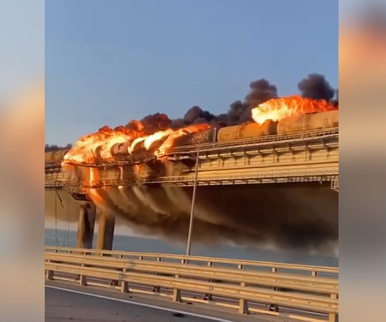 Вранці 8 жовтня на Кримському мосту стався підрив вантажного автомобіля. Це спричинило спалах семи паливних цистерн залізничного складу. Про це повідомили у "Національному антитерористичному комітеті", - пише РБК.