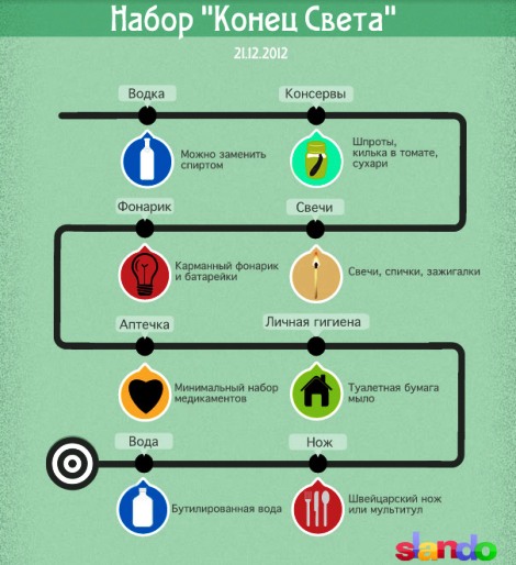 Предприимчивые граждане выставили на продажу готовые наборы на случай конца света, которые включают в себя сухари, консервы, водку и «Корвалол». Об этом сообщает пресс-служба крупнейшего в Украине сайта бесплатных объявлений Slando.
