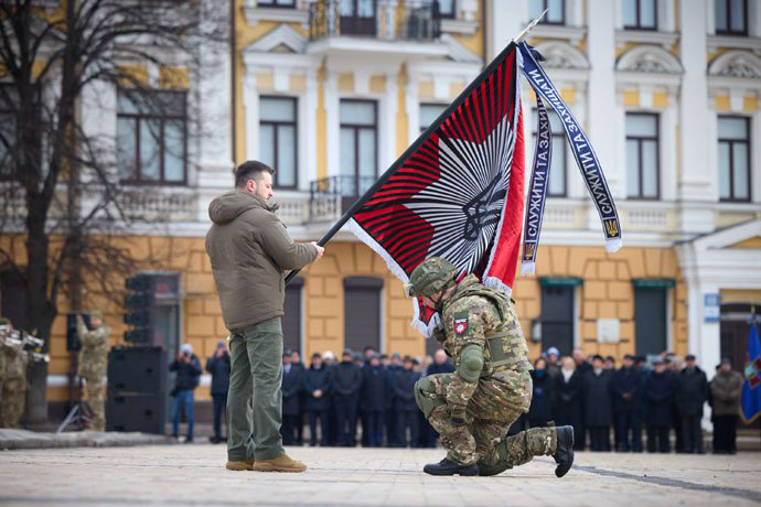 Сьогодні, 24 лютого, на Софійській площі у Києві, Президент Володимир Зеленський вручив державні нагороди а такж бойові прапори українським захисникам.