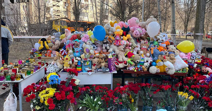 Люди продовжують приносити квіти та іграшки до будинку в Одесі, у якому через російську дронову атаку загинули ці діти.