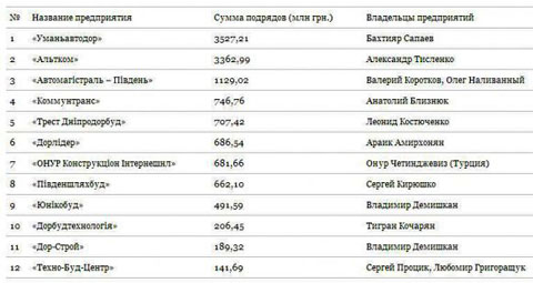 Авторитетный журнал "Форбс" составил рейтинг самых крупных подрядчиков Государственного агентства автомобильных дорог Украины ("Укравтодор") в 2012-м году. По информации издания, практически ко всем из них имеются претензии со стороны Госфининспекции и других контролирующих органов.