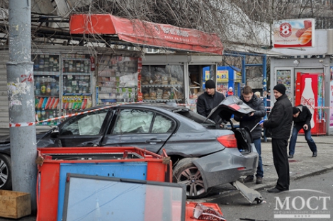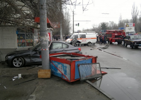 ДТП произошло в результате столкновения автомобилей Nissan и BMW. «Японец» совершал левый поворот, когда в него на большой скорости врезался BMW, двигавшийся во встречном направлении. От удара «немца» отбросило на остановку общественного транспорта, на которой стояли люди. Сбив людей, авто врезалось в киоск. После аварии с черного «бумера» незамедлительно сняли номерные знаки.