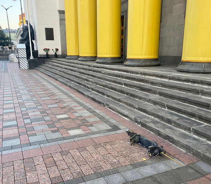 Біля будівлі Верховної Ради України виявили уламки збитого російського ударного безпілотника. Про це 7 вересня повідомляється на сторінці Верховної Ради у Facebook.