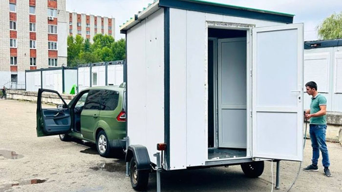 Мобільний санітарний комплекс складається з двох частин. В першій є пральна та сушильна машинки, бойлер на 80 літрів та бак на 250 літрів, а також місце для зберігання одягу. В другій частині є дві душові системи. Його розмір – 1.8 м на 2 м.