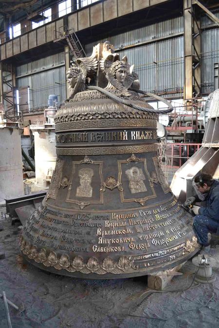 - Наш колокол украшают восемь икон (Святой Троицы, Божией Матери «Игумения Афонской Горы» и «Боголюбская», Собора всех Святых, святого апостола Андрея Первозванного, святого равноапостольного князя Владимира, святого князя Александра Невского и Царственных страстотерпцев), а также надпись: «Святой Равноапостольный Великий Княже Владимире, моли Бога о нас», - рассказал Сергей Самойлов, возглавляющий участок литья церковных колоколов, созданный на заводе в июле 2001 года.