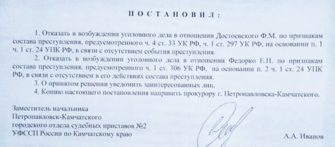 Петропавловск-Камчатский городской отдел судебных приставов провел проверку в отношении автора романа «Идиот» Ф. М. Достоевского по признакам состава преступлений, предусмотренных ч. 4 ст. 33 (подстрекательство) и ч. 1 ст. 297 УК РФ (неуважение к суду). В возбуждении уголовного дела отказано в связи с кончиной писателя.